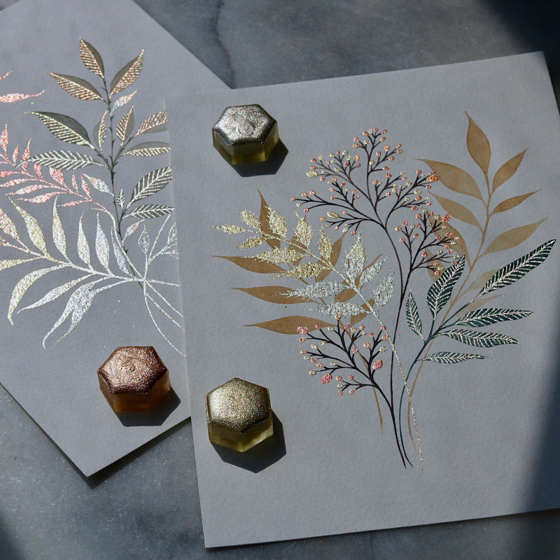 All metallic watercolors are fast to activate and the high opacity leads to easy handling with brushes and calligraphy nibs.