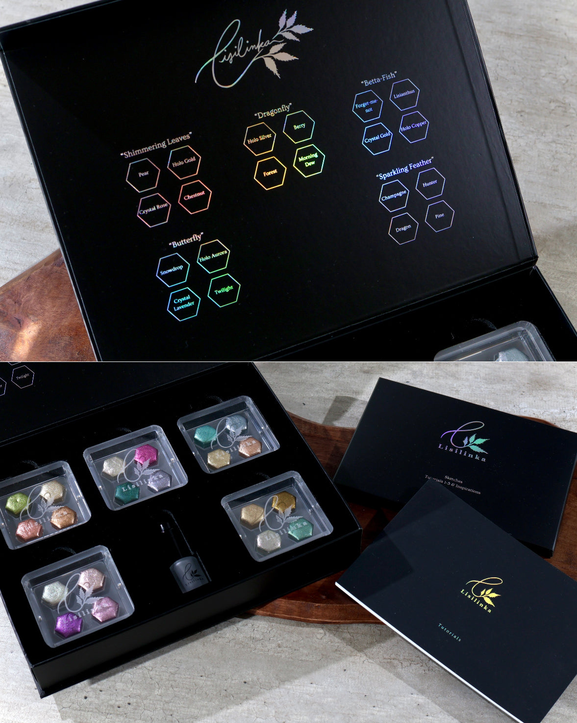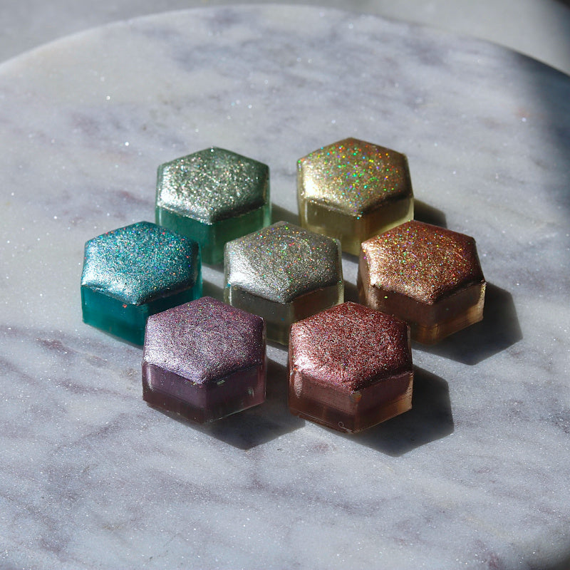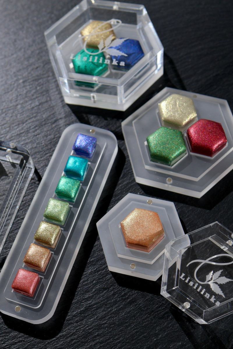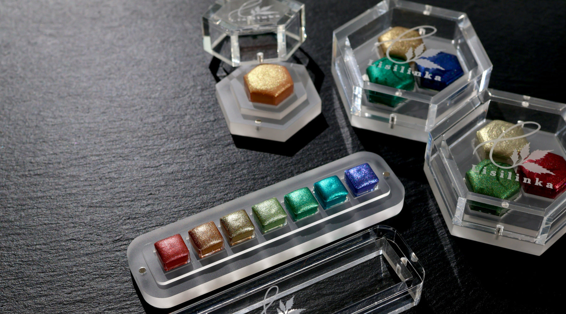 Combinations of special pigments create a variety of metallic watercolors with stunning sparkle. No fixation needed!