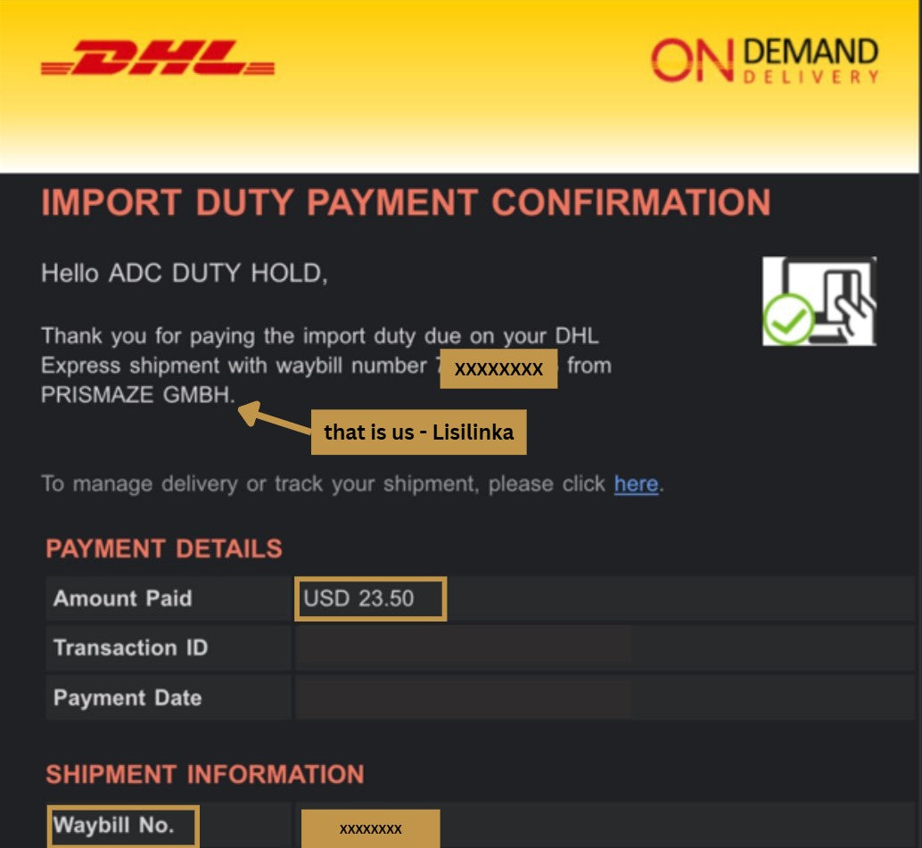 If you receive a request for payment of customs duties from DHL Express after placing an order on lisilinka.com, send us a screenshot to contact@lisilinka.com with the amount and your waybill number and we will send you a discount code for your next order equal to the amount of the customs duties.